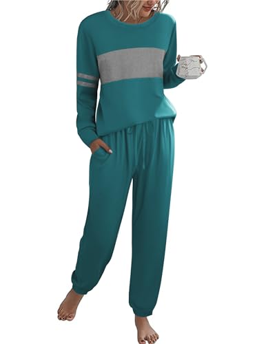 Ekouaer Womens Pajama Sets Long Sleeves 2 Pieces Casual Loungewear Outfits Round Neck Sleepwear with Pockets Blue Green, X-Large