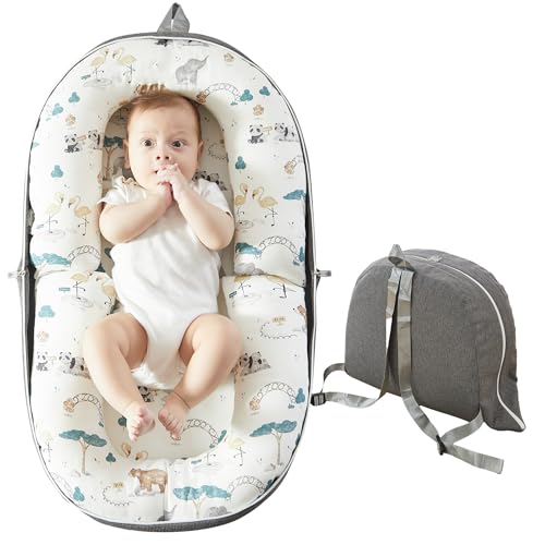 AlamzBeaba Baby Lounger for Newborn, 0-12 Months, Portable Infant Lounger Pillow with Adjustable Support, Soft Breathable Cover, Folds Into Backpack for Travel, Ideal for Home & Outdoor Use - White
