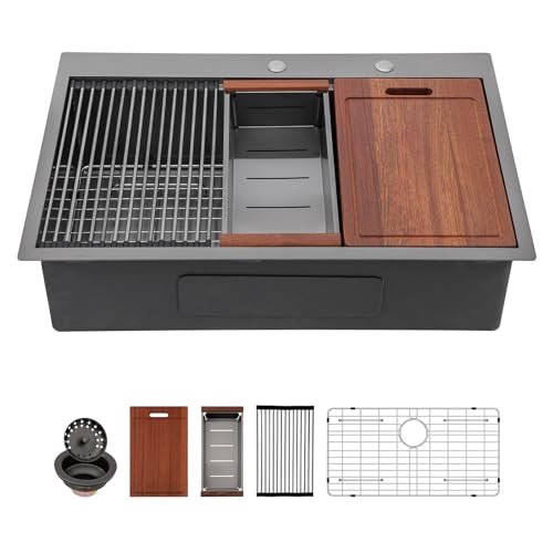 Sarlai 30 Drop Kitchen Sink Black Stainless Steel - 30 x 22 Inch Kitchen Sink Drop In Topmount Ledge Workstation 16 Gauge Gunmetal Black Stainless Steel Single Bowl Over Counter Sinks With Accessories