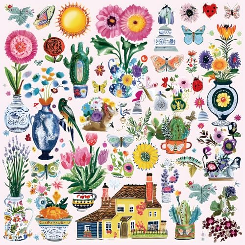 500 Piece Jigsaw Puzzle for Adults Vibrant Garden Scene Cute Butterflies Flowers Birds House Whimsical Doodle Collage Garden Charming Cartoon Art Challenging Yet Relaxing, 20x20 Inch Artwork