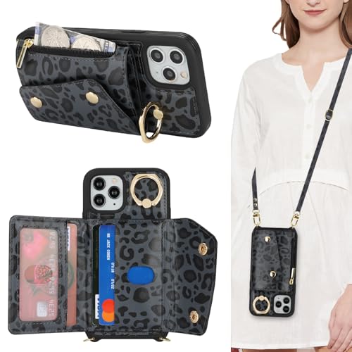 Lipvina for iPhone 11 Pro Case with Card Holder and Strap - Zipper Pocket,Crossbody Lanyard Strap,Credit Card Holder,Stand Ring,Cute Phone Wallet Case for Women(Black Leopard,5.8 Inch)