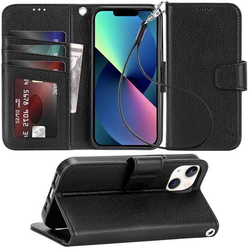 Arae Compatible with iPhone 13 Case with Card Holder and Wrist Strap Wallet Flip Cover for iPhone 13 Men/Women, Wristlet Strap, RFID Blocking (iPhone 13(6.1"), Litchi Black)