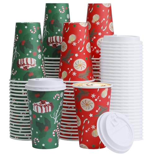 Lamosi 16 OZ Christmas Coffee Cups 50 Pack, 16 Ounce To Go Cups with Lids, Disposable Coffee Paper Cups for Hot Drinks or Cold Beverages