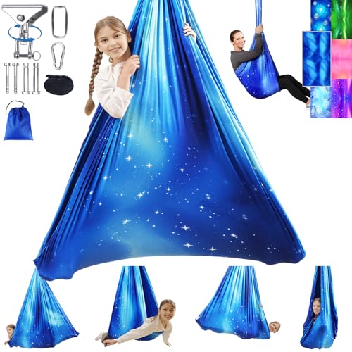 Sensory Swing for Kids and Adults Indoor & Outdoor Double Layer Therapy Cuddle Holds up to 300lbs Adjustable Swing Hammock Chair with 360° Swivel Hanger Kit Effect for Aspergers Autism ADHD(Star Blue)