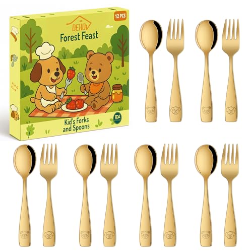 DEHOV Gold Toddler Eating Utensils Set,Set Of 12 Food Grade Stainless Steel Silverware Sets For Kids,Dishwasher Safe Children Small Metal Spoons And Forks Flatware Sets