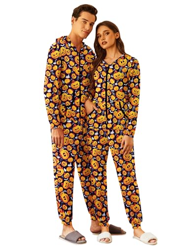 Ekouaer Halloween Matching Onesie for Couples Zipper One Piece Pajamas Adult Hooded Jumpsuit with Pockets Halloween Pumpkin Women M