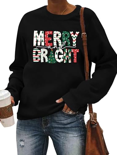 Christmas Sweatshirt Women Merry and Bright Christmas T-Shirt Funny Xmas Lights Blouse Tops Holiday Shirts(Black2, S)