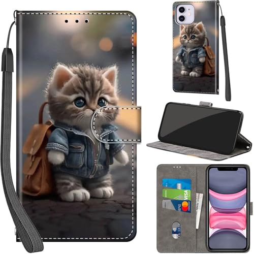 Salanheo Case Wallet for iPhone 11, with [3 Card Slots], Kickstand Magnetic Closure PU Leather Shockproof Protective Flip Cover 6.1", Cat