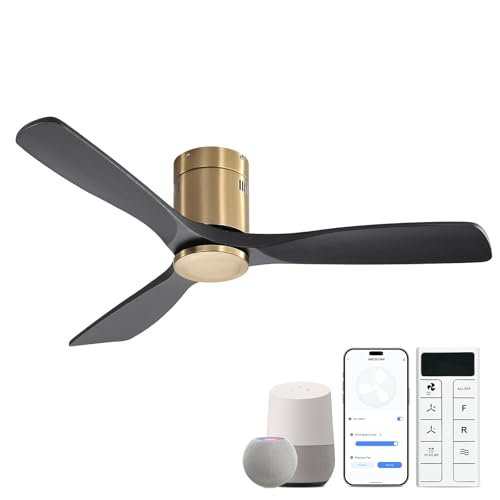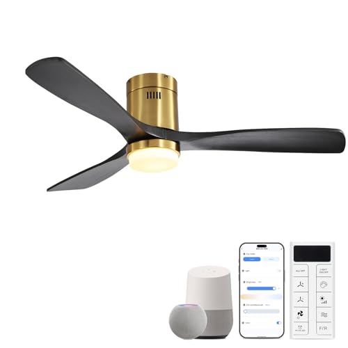 Sofucor 52 Inch Smart Ceiling Fans with Lights-Flush Mount Low Profile Modern Outdoor Solid Wood Ceiling Fans with Alexa/Google Assistant/APP/Remote Control for Bedroom/Farmhouse/Patio, Black Gold