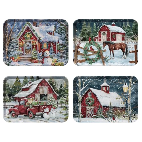 VIYNRAN 4-Piece 15 x 11 Inch Christmas Serving Tray Set, Melamine Reusable Platters with Red Barns, Snowmen, Horses, and Truck, Holiday Party Snack, Fruit, Dessert, and Candy Dishes