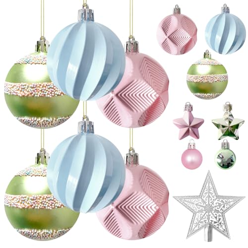 45PCS Christmas Ball Ornaments Set, Macaron Pink Blue Green Colors, Star Tree Topper, Christmas Decorations,Decorative Hanging Ornaments with Small Stars,for Holiday Xmas Tree Decorations