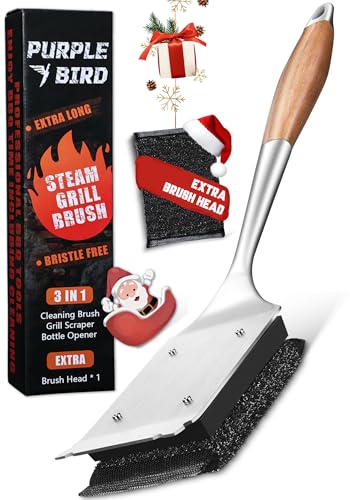 PURPLEBIRD Grill Brush Bristle Free for Outdoor Grill, 3 in 1 BBQ Brush with Scraper & Bottle Opener, Grills Cleaning Brushes with 1 Replacement Head, Grills Scrubber with Wood Handle