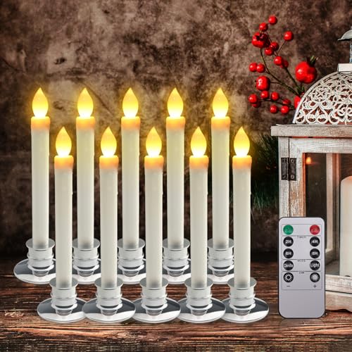 LED Flameless Window Candles With Remote Timer Sliver Base 10 PCS Battery Operated Flickering Taper Candle Lights With Removable Sliver Candle Holders Best Gift For Xmas Wedding Home Dinner Décor