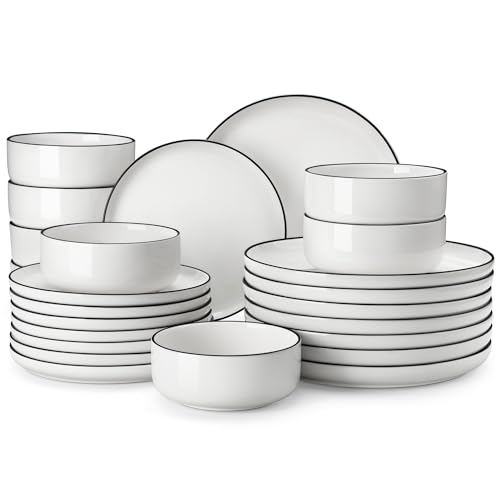 MALACASA Plates and Bowls Sets, 24 Pieces Modern Porcelain Dinnerware Set for 8 White Kitchen Dinner Dining Ware Set wtih Black Rim Ceramic Dishware Dishes Microwave and Dishwasher Safe, Series LUNA