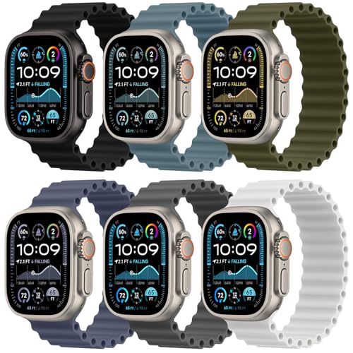6 Pack Silicone Ocean Solo Loop Bands Compatible with Apple Watch Ultra 3/2/1 49mm 46mm 45mm 44mm 42mm, Soft Stretchy Sport Replacement Wristband for iWatch Series 11 10 9 8 7 6 5 4 3 SE