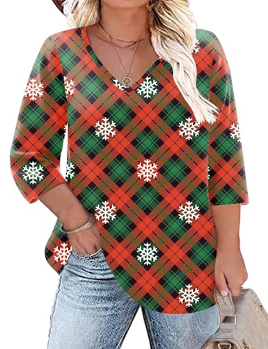 TFSDOD Ladies Christmas Tops Plus Size Tops for Women 3/4 Length Sleeve Womens Tops V-Neck T-Shirts Christmas Top 5XL