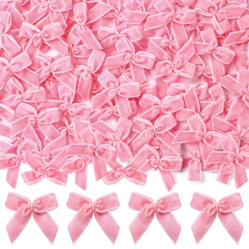 JOICEE 120 Pcs Mini Velvet Bows for Crafts, 1.4 Inch Christmas Pink Velvet Ribbon Bows Xmas Tiny Wreath Twist Tie Bows with Box Stickers for Sewing DIY Craft Decorations Tree Wreath Garland Decor