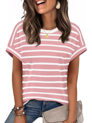 WIHOLL Summer Outfits for Women 2026 Trendy Spring Tops Vacation Clothes Fashion Valentines Short Sleeve Shirts Lightweight Casual Blouses Pink Stripes XL