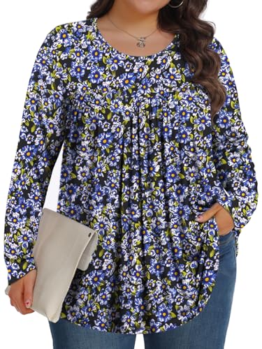 Tencede Plus Size Tops for Women Fall Long Sleeve Shirts Crew Neck Casual Loose Tunic Blouse Five Blue Flowers 5X