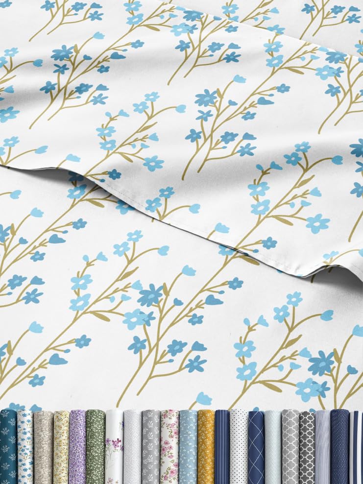 Floral Sheets - Blue Floral Bed Sheet Set - 1 Flat, 1 Fitted & 1 Pillowcase w/ Deep Pockets - Comfy, Wrinkle & Fade Free - Boho Botanical Bedding - Ultra-Soft, Breathable and Cooling - Twin Size Set