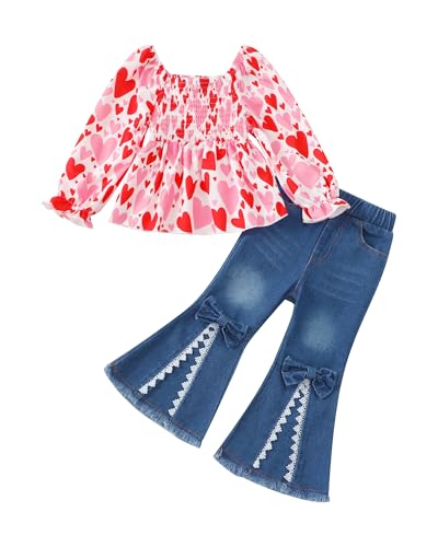 18 Months Girl Clothes Baby Toddler 24 Month Girls Clothes Puff Sleeve Pink Heart Smocked Square Neck Top Lace Flared Denim Pants Bell Bottom Clothing Valentines Day Winter Fall Jeans Outfit