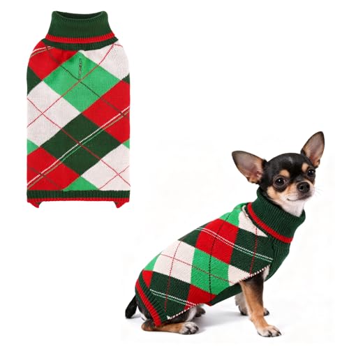 KOOLTAIL Dog Christmas Sweater Pet Knitted Clothes - Classic Plaid Pull Over Turtleneck Dog Sweaters with Leash Hole Warm Dogs Winter Clothing for Small Medium Dogs Cats Puppy Boy Girl Red & Green XS