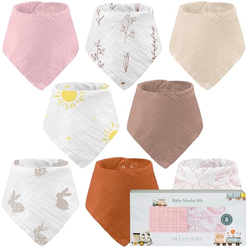 LILY O LAUREL Muslin baby bandana bibs for drooling and teething, 100% cotton, Baby bib for boys and girls, Muslin Bibs, Drool Bibs – Pack of 8