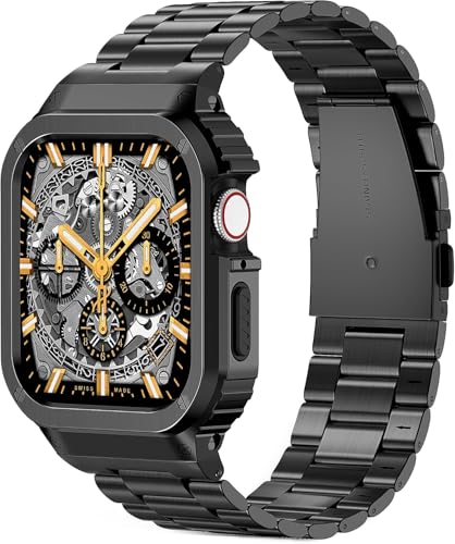 HEYZONE Metal Band Compatible with Apple Watch Band 44mm 45mm for Series SE/SE2 9 8 7 6 5 4,Stainless Steel iWatch Band with Bumper Case for Men,iWatch Strap with Metal Protective Cover