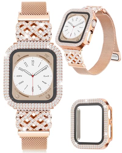 Metal Bracelet for Apple Watch Bands for Women 45mm with Bling Case, Rose Gold Dressy Magnetic Slim Strap for iWatch Bands Series 9 8 7 for Girl, Fancy Stainless Steel Mesh Loop iPhone Watch Band