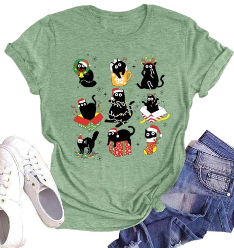 Christmas Shirts for Women Meowy Christmas Tshirt Cat Graphic Tee Short Sleeve Cat Lover Gifts Tops(Green2,X-Large)
