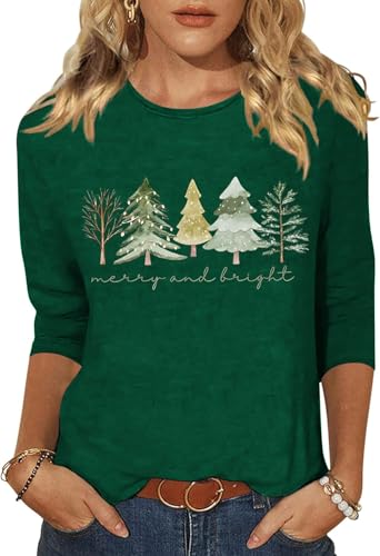 Womens Merry and Bright Crewneck Shirt Funny Xmas Trees Graphic 3/4 Sleeve Tee Winter Holiday Family Matching Top(XL,Green03)