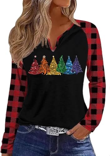 Earlymemb Womens Coloful Christmas Tree V Neck Shirt Funny Xmas Star Buffalo Plaid Raglan Sleeve Tee Holiday Party Family Matching Winter Tops(L,C-Black-5)