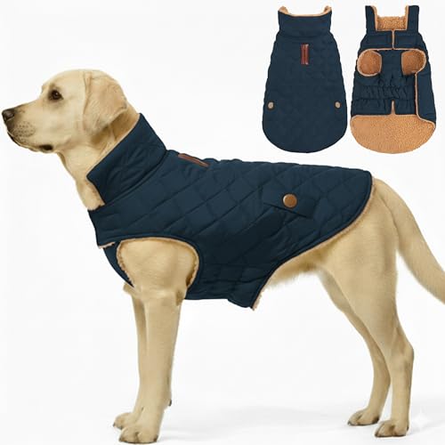 azuza Dog Jacket for Medium Dogs Waterproof & Windproof Dog Coat for Small Dogs with Thick Fleece, High Collar with Leash Hole, Adjustable Velcro & Elastic Belly, Navy 2XL
