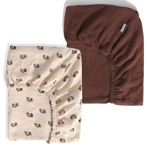Breathable Muslin Crib Sheets for Boys 2 Pack Organic Cotton Crib Sheets Neutral for Baby Girls Soft Sheets Fitted Toddler Bed&Standard Crib Mattress 28"x 52"(Brown&Rainbow)