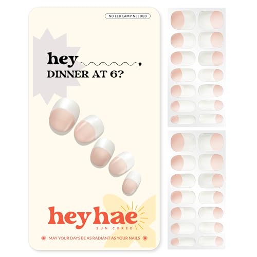 Heyhae Semi Cured Gel Nail Strips | No LED Lamp Needed | French, Pink, Spring | Easy Apply & Remove, Salon Quality | Includes 28 Strips, 1 Prep Pads, Nail File & Wooden Stick - Hey, Dinner at 6?