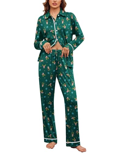 Ekouaer Womens Pajama Sets Long Sleeve Sleepwear Soft Button Down Pjs 2 Piece Loungewear witn Pants,Green Elk,L