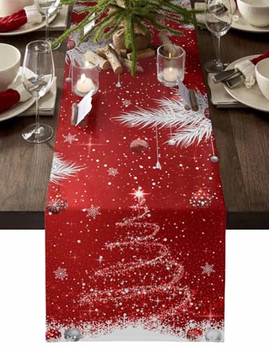Christmas Decor Cotton Table Runners for Kitchen Dining Table/Cabinet/Holiday Parties, Red Sparkle Christmas Tree Ornaments Washable Dresser Scarf White Pine Needle Dining Runners 13" x 48"