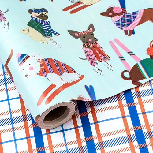 LeZakaa Reversible Christmas Wrapping Paper Roll, Dogs Skiing and Blue Orange Buffalo Plaid Fun Winter Gift Wrap for Kids Pet Lovers Holidays, Mini Roll 17 in x 16.4 Ft