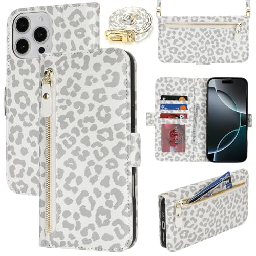 Lipvina for iPhone 16 Pro Wallet Case for Women,Zipper Pocket,PU Leather Phone Case Stand flip Cover Crossbody Lanyard Strap Zipper Credit Card Holder Slots for Apple 16 Pro,White Leopard