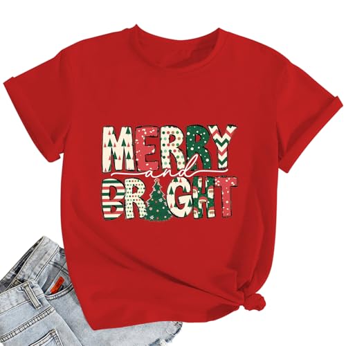 Merry and Bright Shirt Women Christmas Tree Tshirts Ladies Xmas Short Sleeved Tee Tops