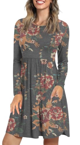 LONGYUAN Womans Hide Belly Long Sleeve Dresses Casual Loose Fashion Valentine's Swing Dress Fl 2XL Brown Floral Black
