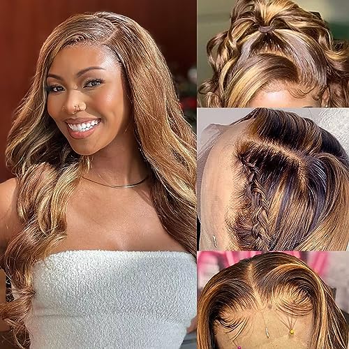 FASCARA 13X4 Highlight Ombre Lace Frontal Wigs Human Hair 4/27 Honey Blonde 180% Density Body Wave Wig for Women HD Transparent Lace Front Wig with Highlights Colored Glueless Wigs Human Hair 24 Inch