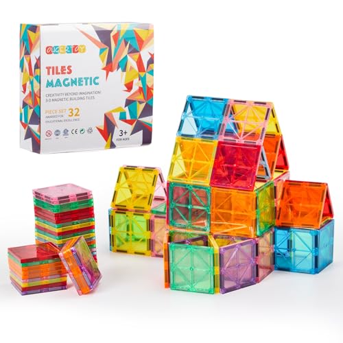 OugerToy 32-Pack Magnetic Tiles–Rainbow Builder Set, 2.95in STEM Construction Kit with Transparent Windows, Expand Creative Play for Kids