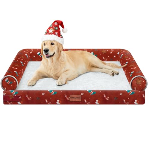 Large Dog Bed Orthopedic Washable: Christmas Pattern Big Dogs Beds with Bolster Puppy Sofa Couch Waterproof Removable Cover - Red