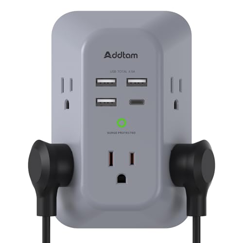 Addtam Surge Protector Outlet Extender, Multi Plug Wall Outlet with 4 USB Ports(1 USB-C), 3-Sided 1800J Power Strip Plug Extension Outlet Splitter, Gray