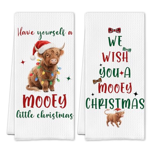 SereneHanctuary Merry Christmas Highland Cow Kitchen Towels, Highland Cow Gifts Dish Tea Towels, Holiday Xmas Santa Hat Heifer Decorative Hand Towel for Kitchen Bathroom, 16x24 Inch Set of 2