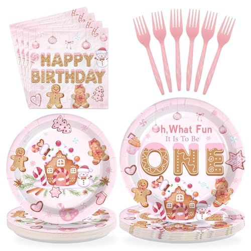 96Pcs Christmas Gingerbread Party Supplies Cute Candy Gingerbread Man Plates and Napkins Pink Oh What Fun It Is to Be One Tableware Sets for Kids Girls Xmas Baby Shower Birthday Party Decor Serves 24