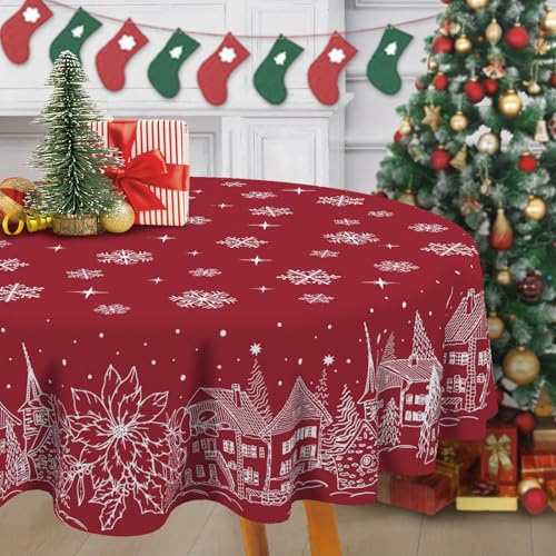 Livcoz Red Christmas Town Round Tablecloth 70 Inches, Xmas House Poinsettia Pine Trees Decorative Dining Table Cloth, Winter Holiday Snowflakes Stars Dinner Tablecover Picnic Party Decoration