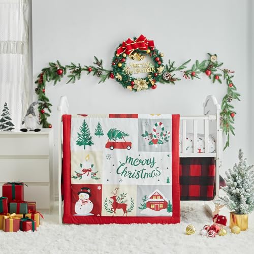 Christmas Red Crib Bedding Set 3 Pieces New Year Style Quilted Plaid Comforter with Fitted Sheet and Bed Skirt - Cute Snowman House Deer Red Gray Design Baby Crib Bed Set
