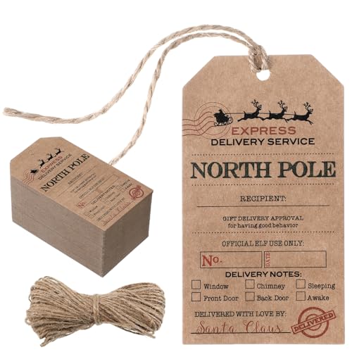 Fuyoooo 100 Pcs North Pole Christmas Presents Tags from Santa Vintage Xmas Santa Gift Tags with String for Presents Christmas Wrapping Paper Labels for Xmas Party Treat Cookie Decor